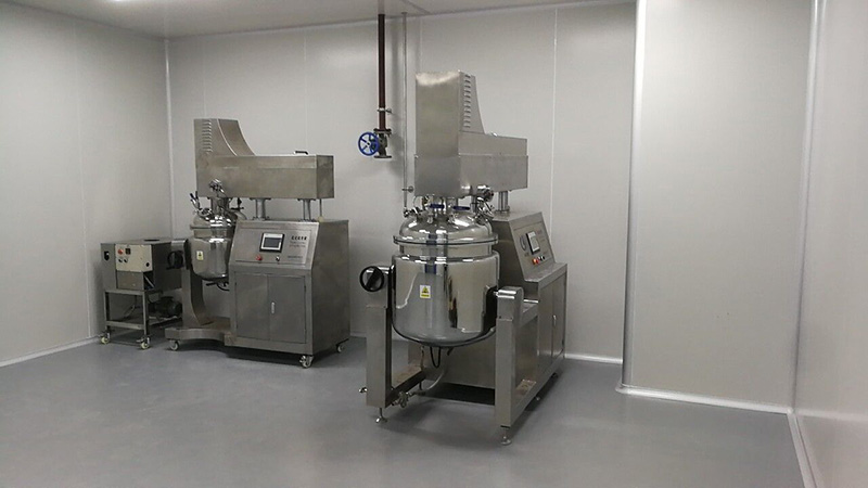 物料在水鍋、油鍋內(nèi)通過加熱、攪拌進(jìn)行混合反應(yīng)后,由真空泵吸入乳化鍋,通過乳化鍋內(nèi)上部的中心攪拌、聚四氟乙烯刮板始終迎合攪拌鍋形體,掃凈掛壁粘料,使被刮取的物料不斷產(chǎn)生新界面,再經(jīng)過葉片的剪斷、壓縮、折疊,使其攪拌、混合而向下流往鍋體下方的均質(zhì)器處,物料再通過高速旋轉(zhuǎn)的切割輪與固定的切割套之間所產(chǎn)生的強(qiáng)力的剪斷、沖擊、亂流等過程,物料在剪切縫中被切割,迅速破碎成200um-0.2um的微粒,由于乳化鍋內(nèi)處于真空狀態(tài),物料在攪拌過程中產(chǎn)生的氣泡被及時(shí)抽走。采用抽真空的方式,使所生產(chǎn)的制品在攪拌過程中不再混入氣泡,從而保證可制造出富有光澤、細(xì)膩及延展性良好的產(chǎn)品。
